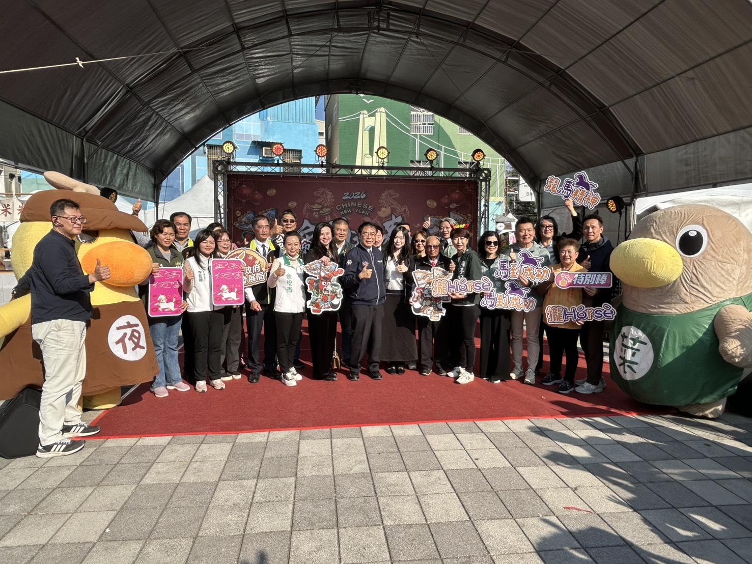 ▲2026新化年貨大街隆重開幕 市長黃偉哲與立委陳亭妃、市議會副議長林志展、市議員李偉智、余柷青、陳碧玉等貴賓與台南市市場處最夯的吉祥物,菜奇鴨、夜奇鴨一同合照。(記者黃雋淮 攝)